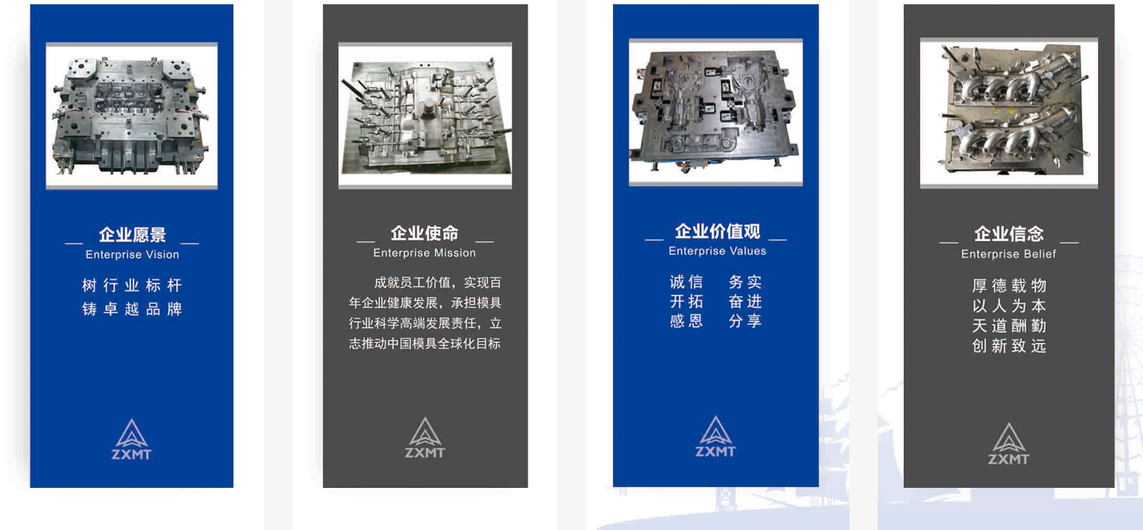 我們期望用品德和誠信詮釋“眾鑫模具”所特有的文化內涵,在激烈的市場競爭中,努力打造與合作伙伴互惠互利、合作雙贏的價值鏈;為中國模具高端市場服務,為我們的社會、我們的企業、我們的員工創造和諧與價值。